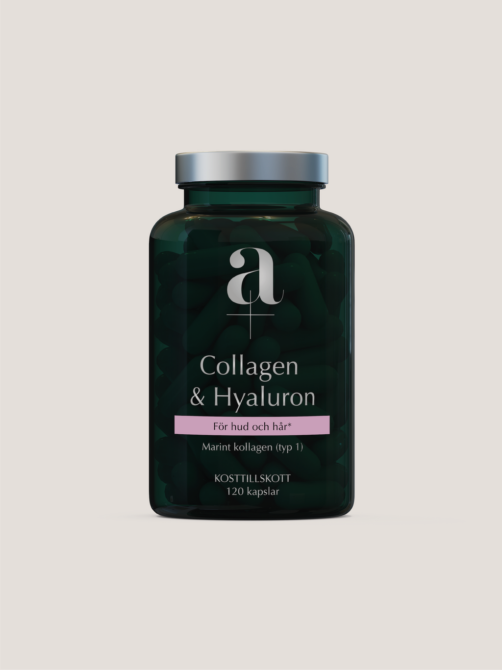 Kollagen finns naturligt i kroppen, men redan från att man fyller 25 år minskar kroppens produktion av ämnet. Och det låter ju tråkigt, framför allt eftersom kollagen bidrar till hudens spänstighet, hårets lyster och skelettets styrka. Så, är det kört efter 25? Nej såklart inte. A+ Collagen & Hyaluron innehåller vitamin C, riboflavin och biotin som tillsammans bidrar till hudens flexibilitet [1,2] och samtidigt har betydelse för för hårets och skelettets normala funktion [3].