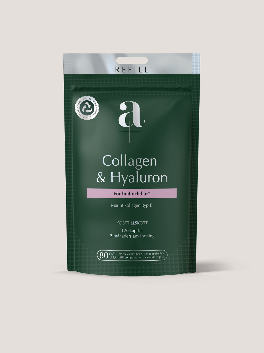 A+ Collagen & Hyaluron i smidig och återvinningsbar refillpåse.