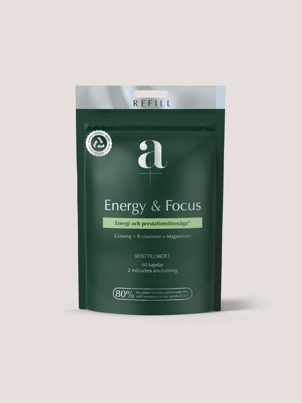 A+ Energy & Focus i smidig och återvinningsbar refillpåse.