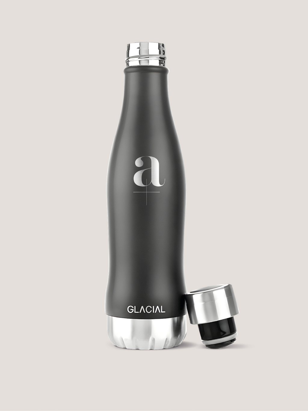 A+ Glacial Bottle är en vattenflaska av rostfritt stål med "click and drink"-kork som passar för både kall och varm dryck. En återanvändbar flaska som håller länge är ett hållbart alternativ till att ständigt konsumera nya plastflaskor. Termosflaskan håller kall dryck kyld i upp till 24 timmar, och den håller värmen i varma drycker i upp till 12 timmar. Den är godkänd för alla typer av livsmedel, och är utvecklad för att inte ta smak av exempelvis kaffe.