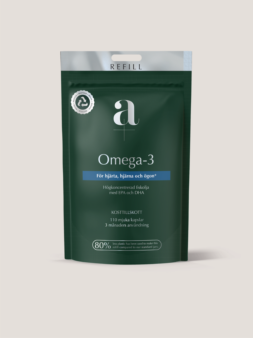 A+ Omega-3 i smidig och återvinningsbar refillpåse.